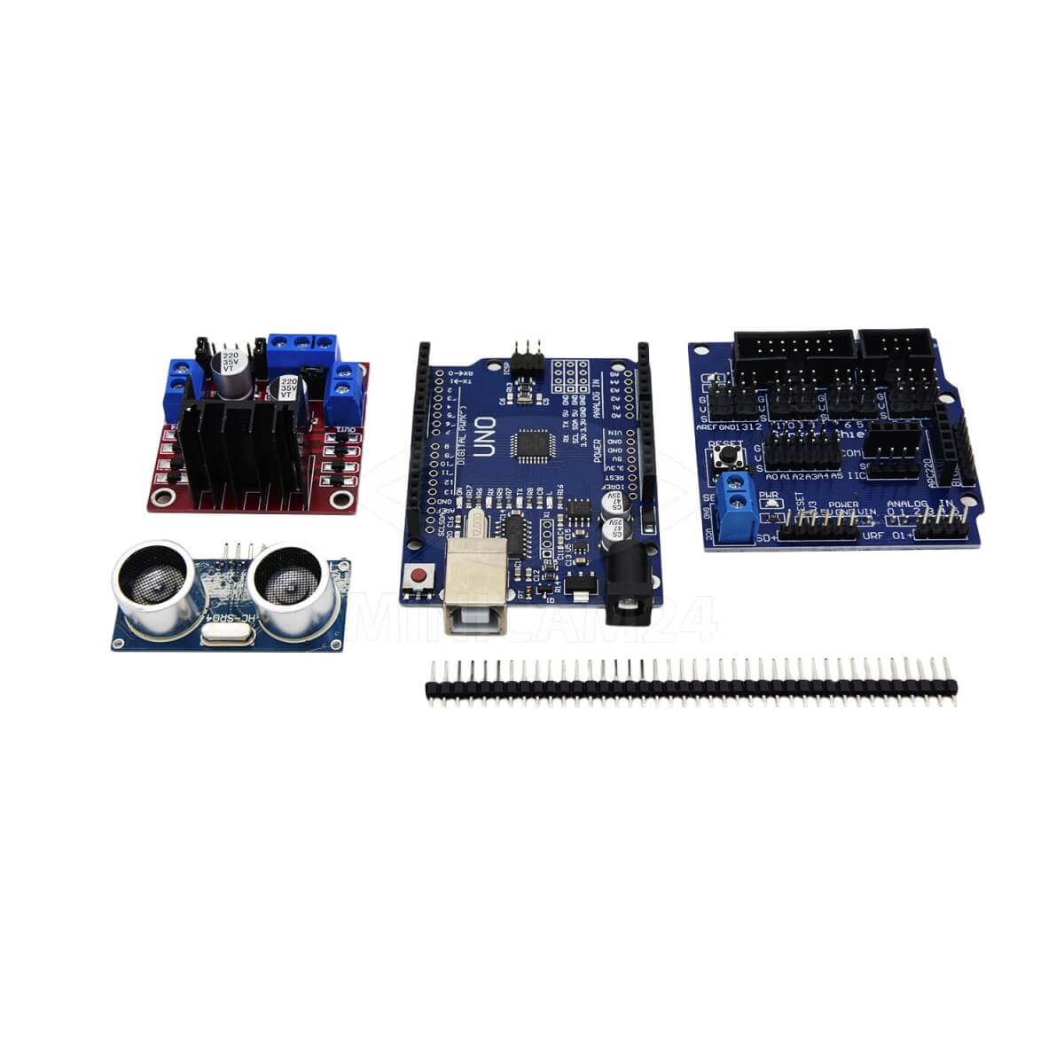 Набор для моделирования Ардуино (Arduino) 2WD Car Robot Lafvin – конструктор для сборки машинки-робота. Набор подойдет начинающим робототехникам, а также опытным инженерам. Конструктор включает в себя плату, датчики, модули, двигатель, колеса, провода. По итогу работы сборщик получит машинку, которая сможет объезжать препятствия, двигаться по заданной траектории, выполнять развороты. Управлять роботом можно с пульта или со смартфона по Bluetooth.