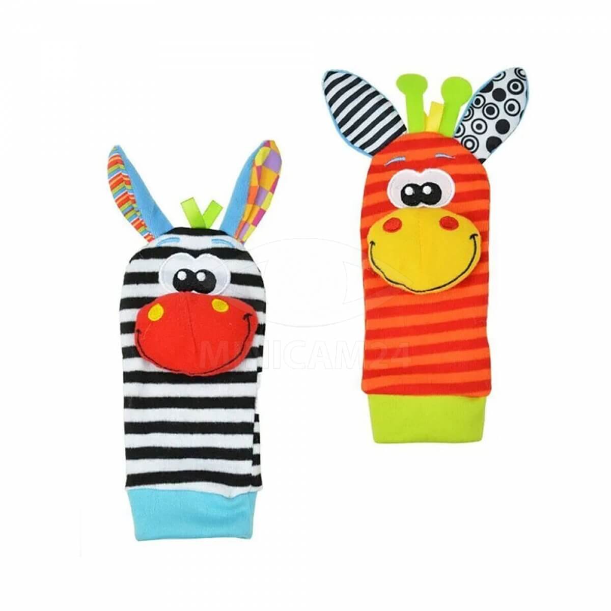 Детские погремушки Mopet носки, браслеты с животными в виде зебры и жирафа подойдут для малышей с первых дней жизни. Выполнены из мягкого плюша, он не провоцирует раздражение на нежной детской коже и не вызывает аллергию. Погремушки стилизованы под милых зверушек: по центру есть аппликация в виде забавной мордочки, сверху расположились ушки. За игрушкой легко ухаживать: достаточно стирать ее по мере загрязнения. При желании погремушку можно носить как браслет – для этого на нижней части предусмотрено специальное крепление.
